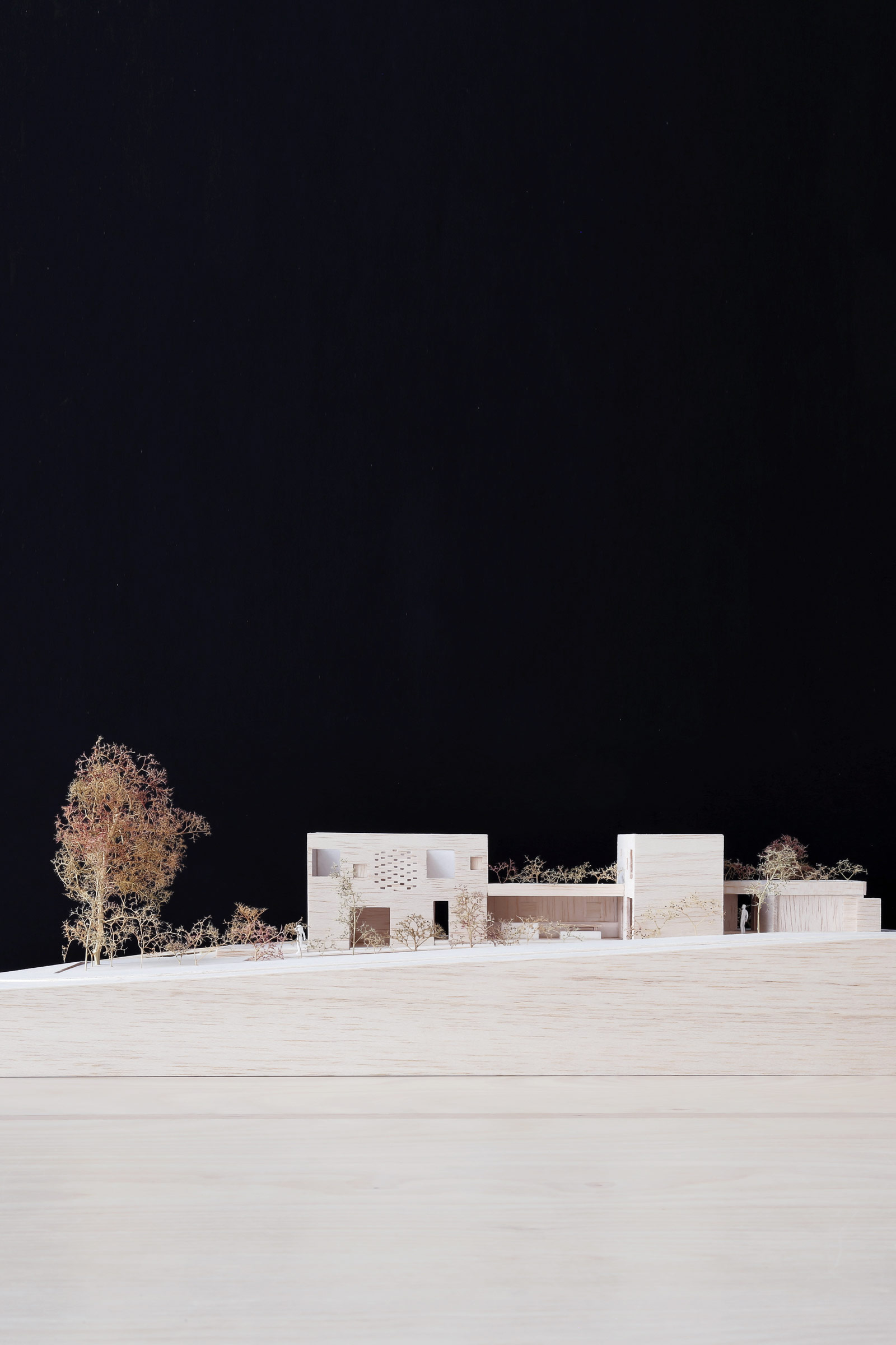 - 2. A balsa wood model of the project, showing the two brick towers that bookend the home.