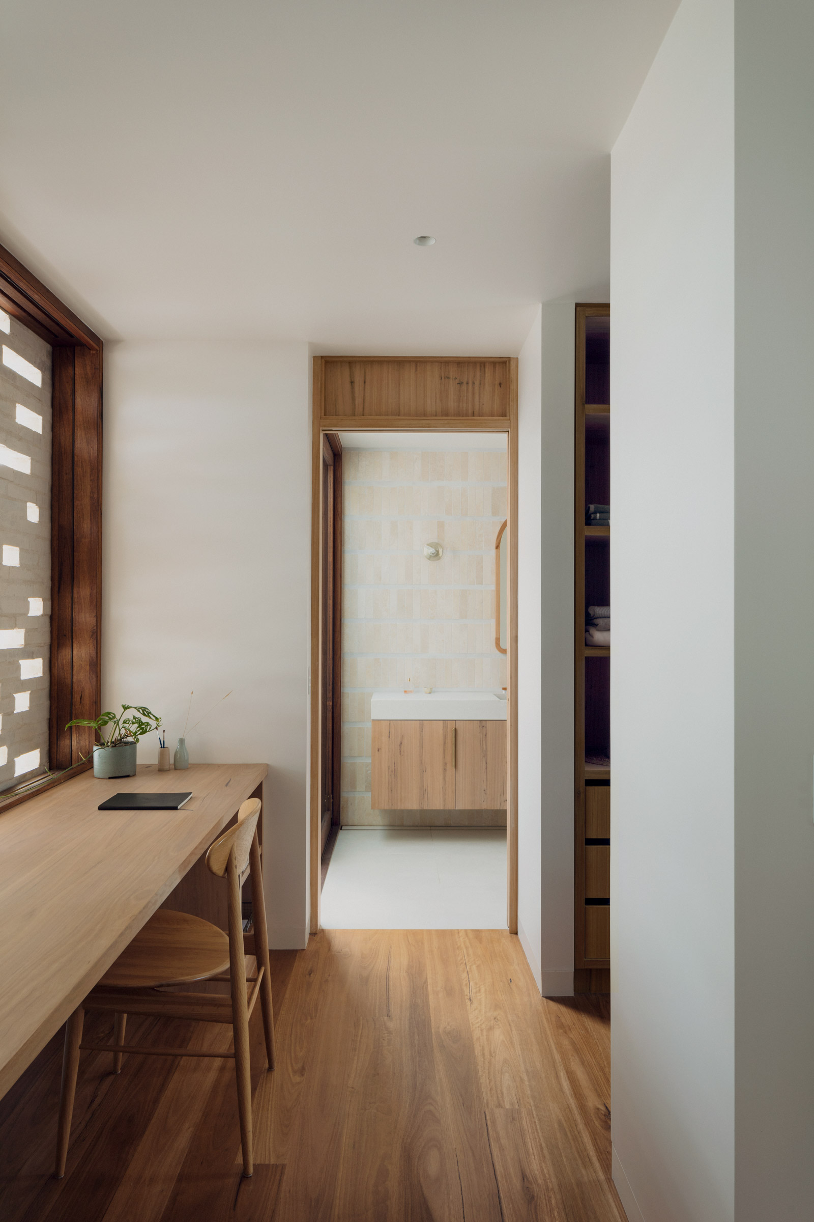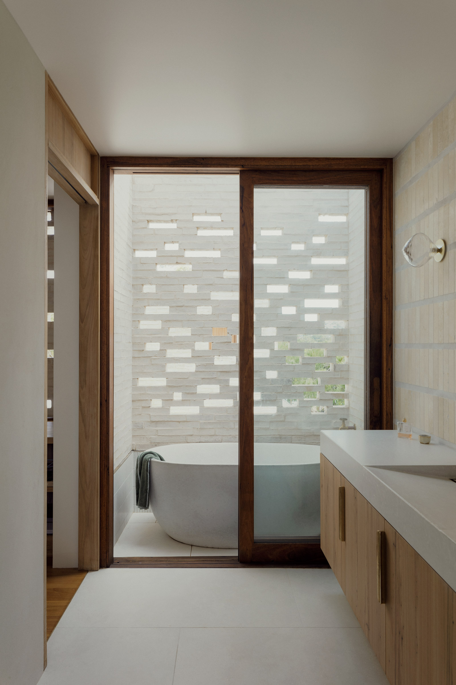 This project, like all of our builds, was the work of many talented hands. Our structural engineer preserved the design’s integrity through clever and ambitious engineering solutions. Folk Studio, the project’s interior designer, brought tactility and whimsy to the interior finishing, while Lindy Hulton Larsen, our landscape architect, realised our client’s brief to ‘take the home’s palette into the garden.’ Russ Davis and his team at Avalon Constructions worked with grace, ingenuity, and craftsmanship. Credit also extends to each of subcontractors, including our bricklayer, who was instrumental in testing the hit-and-miss brick screens via 1:1 mock-ups on-site.