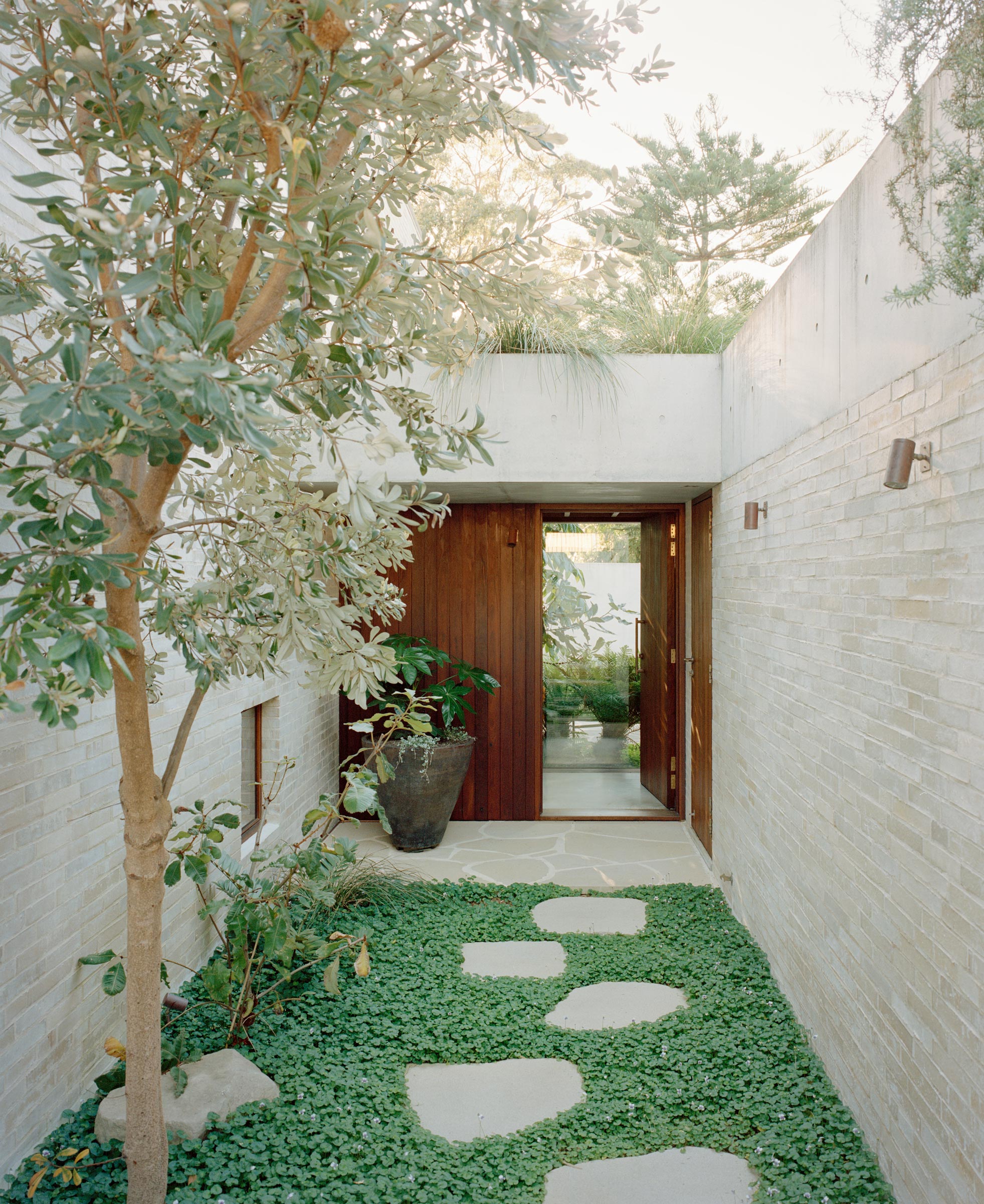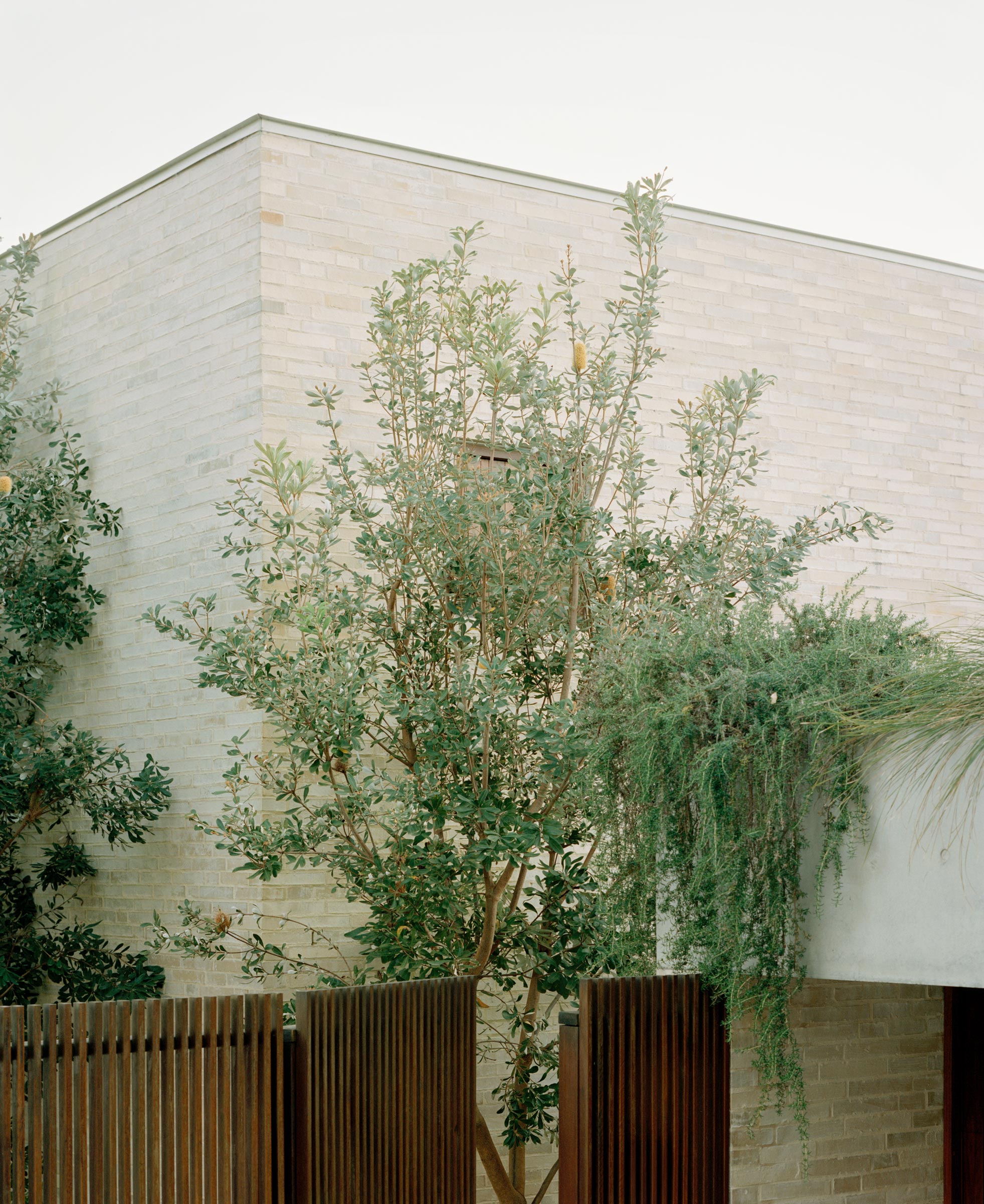 Curl Curl House is, in essence, a walled garden house. In its context, it feels calm, confident, and quiet. Its twin sentinels sit behind their boundary wall, peering above the fence and visible between growing greenery.