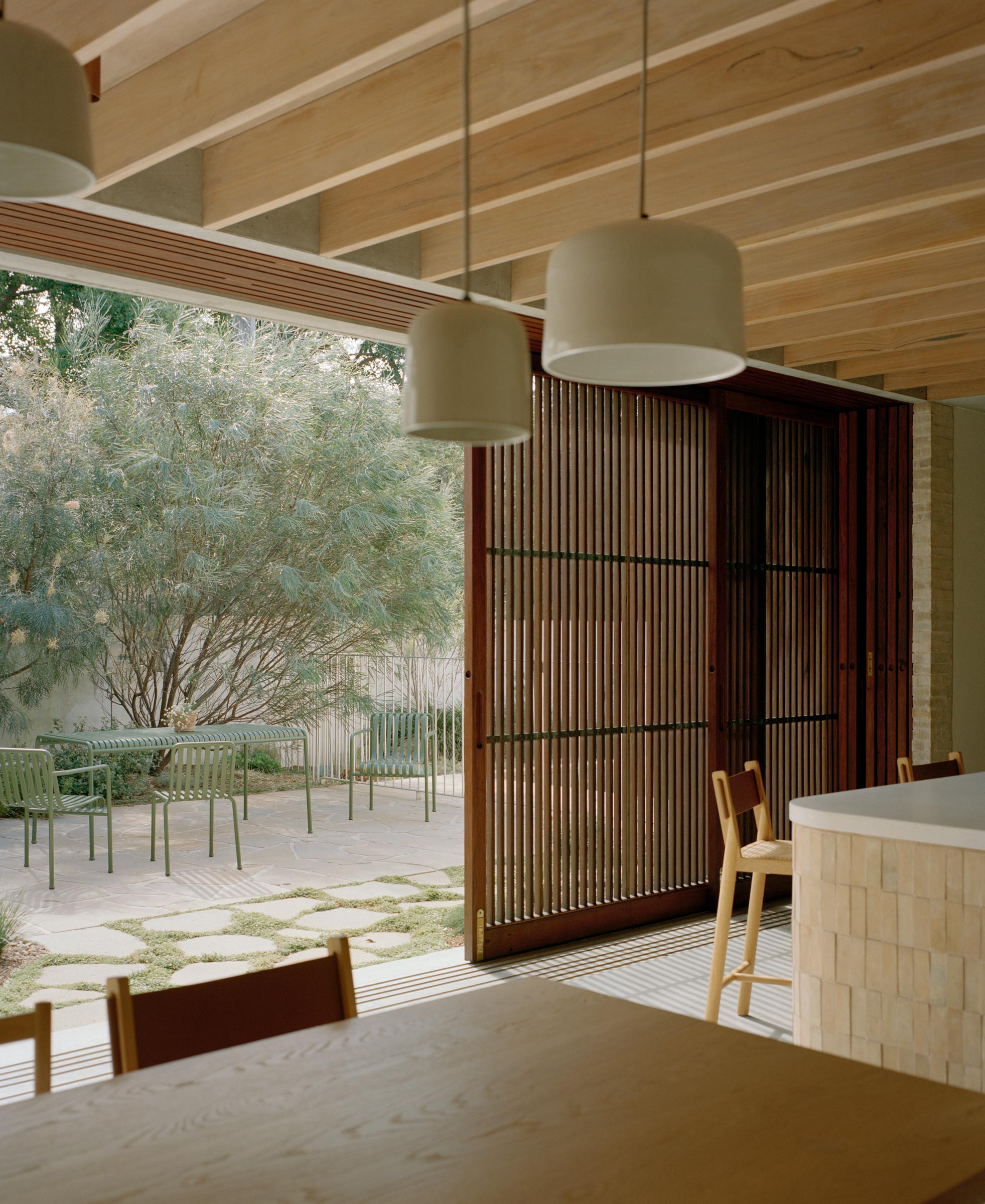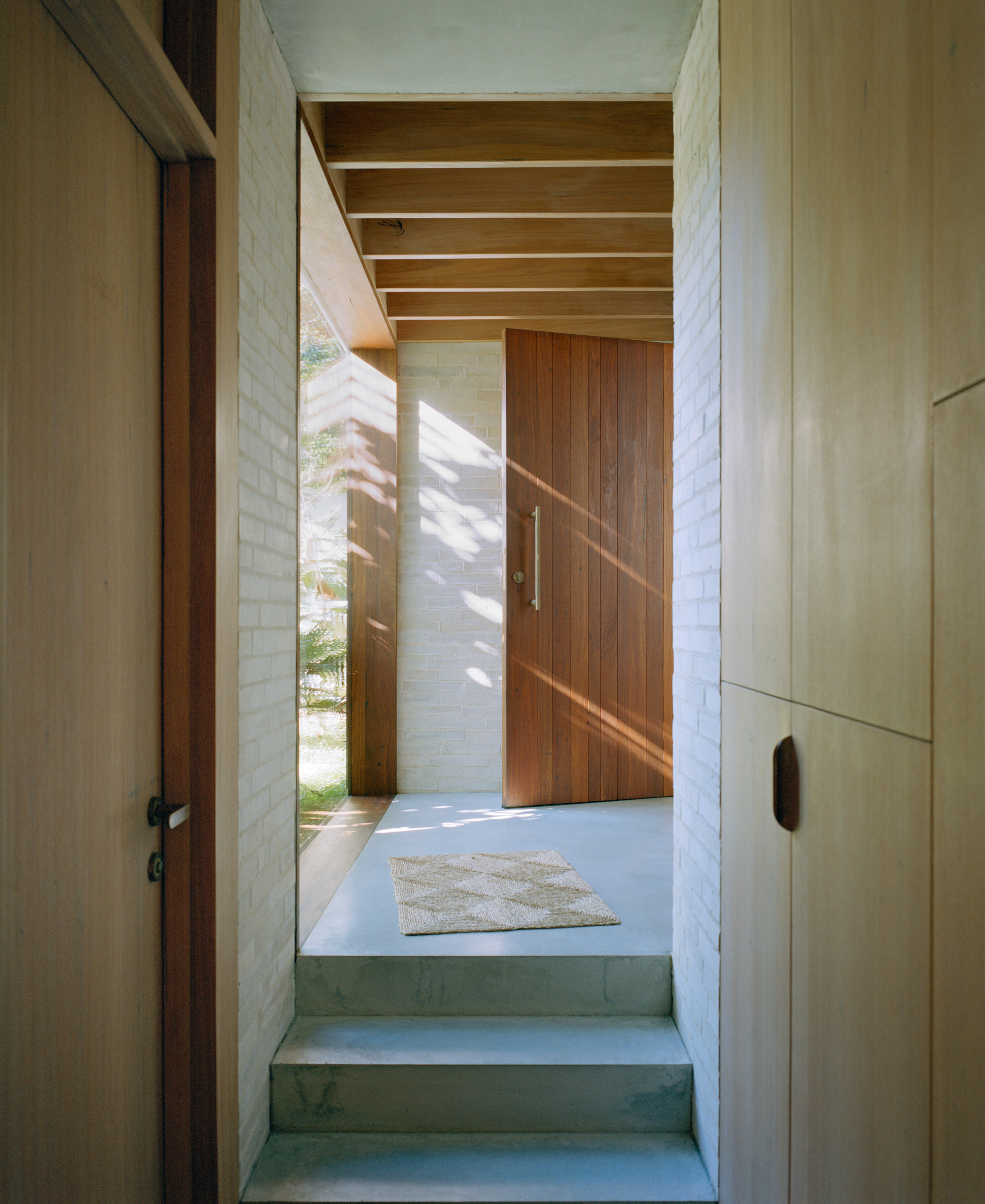 - 2. A timber-lined entry sequence steps up into filtered afternoon light.