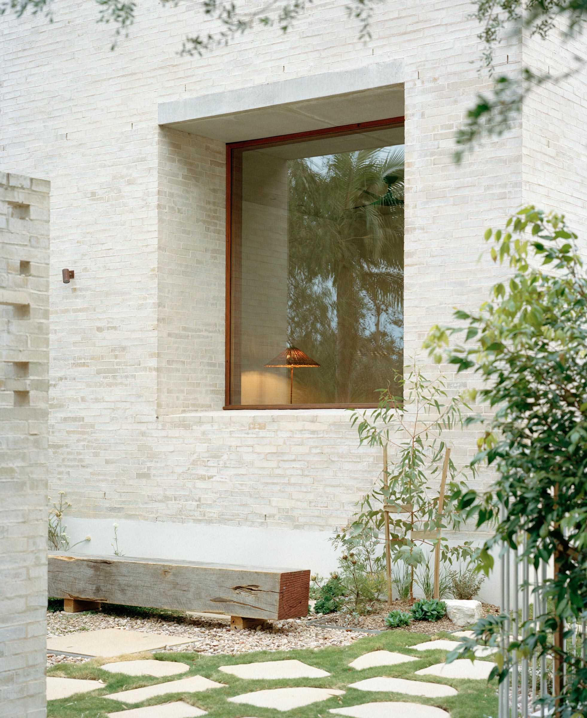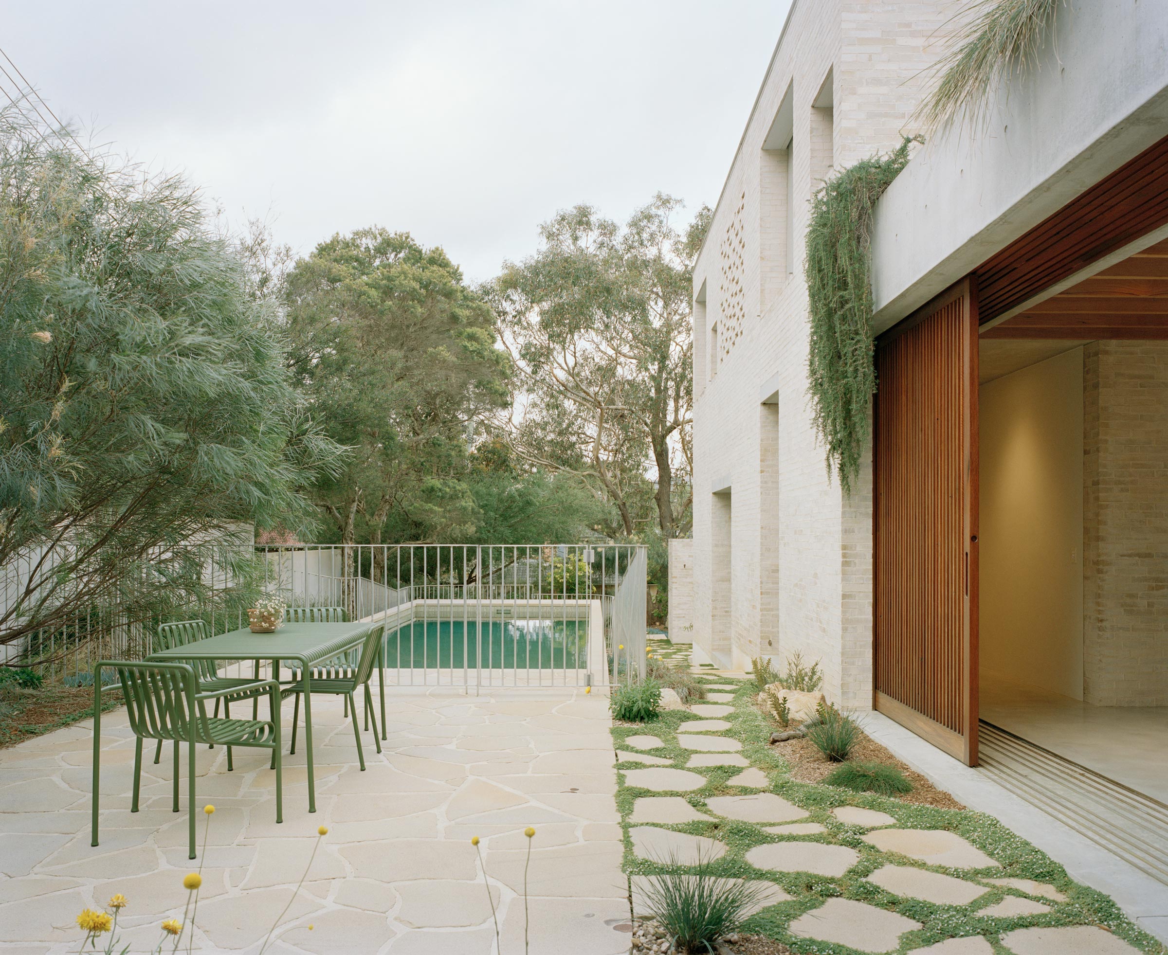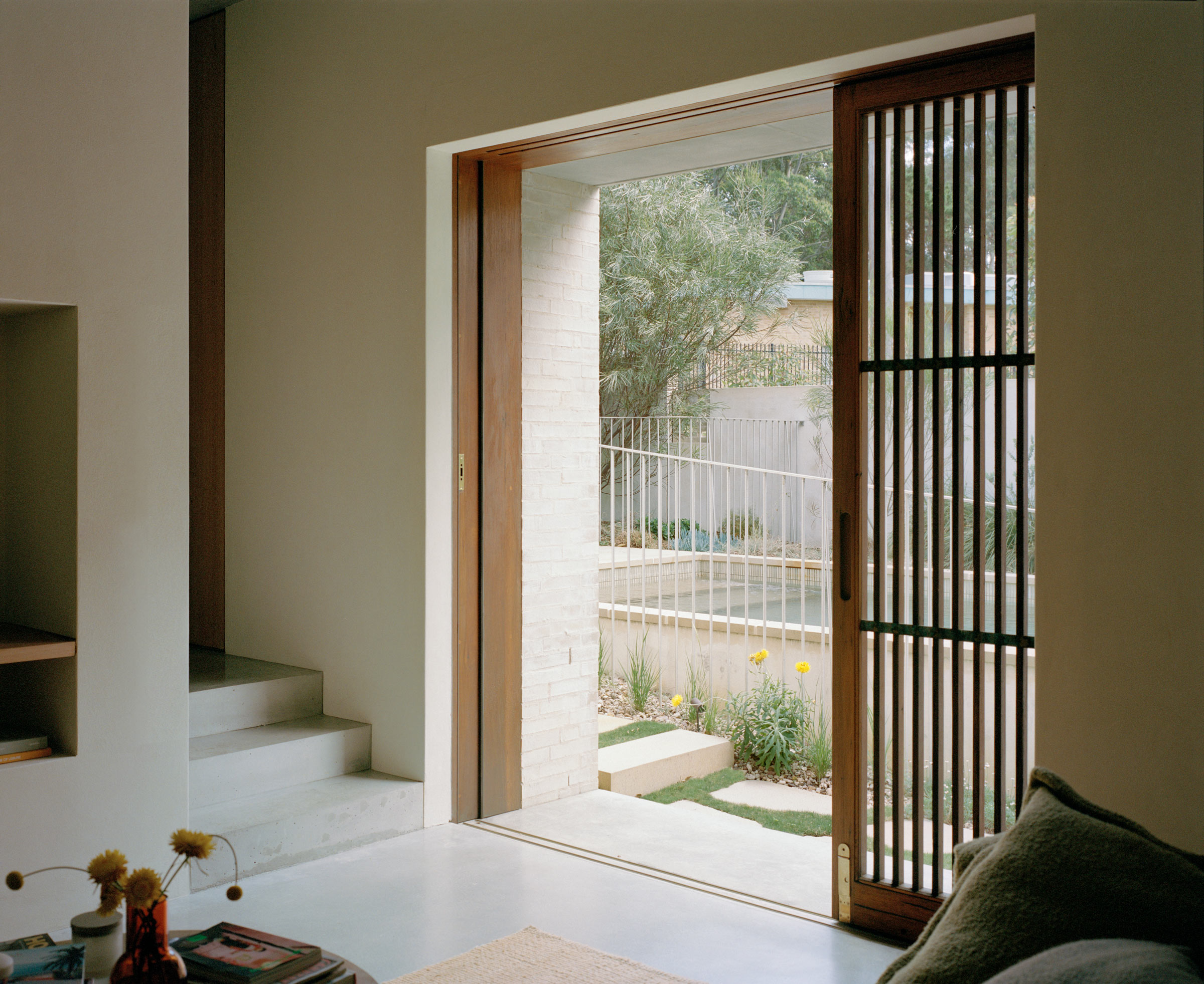 - 1. Pale brick and timber openings are reflected across the pool.