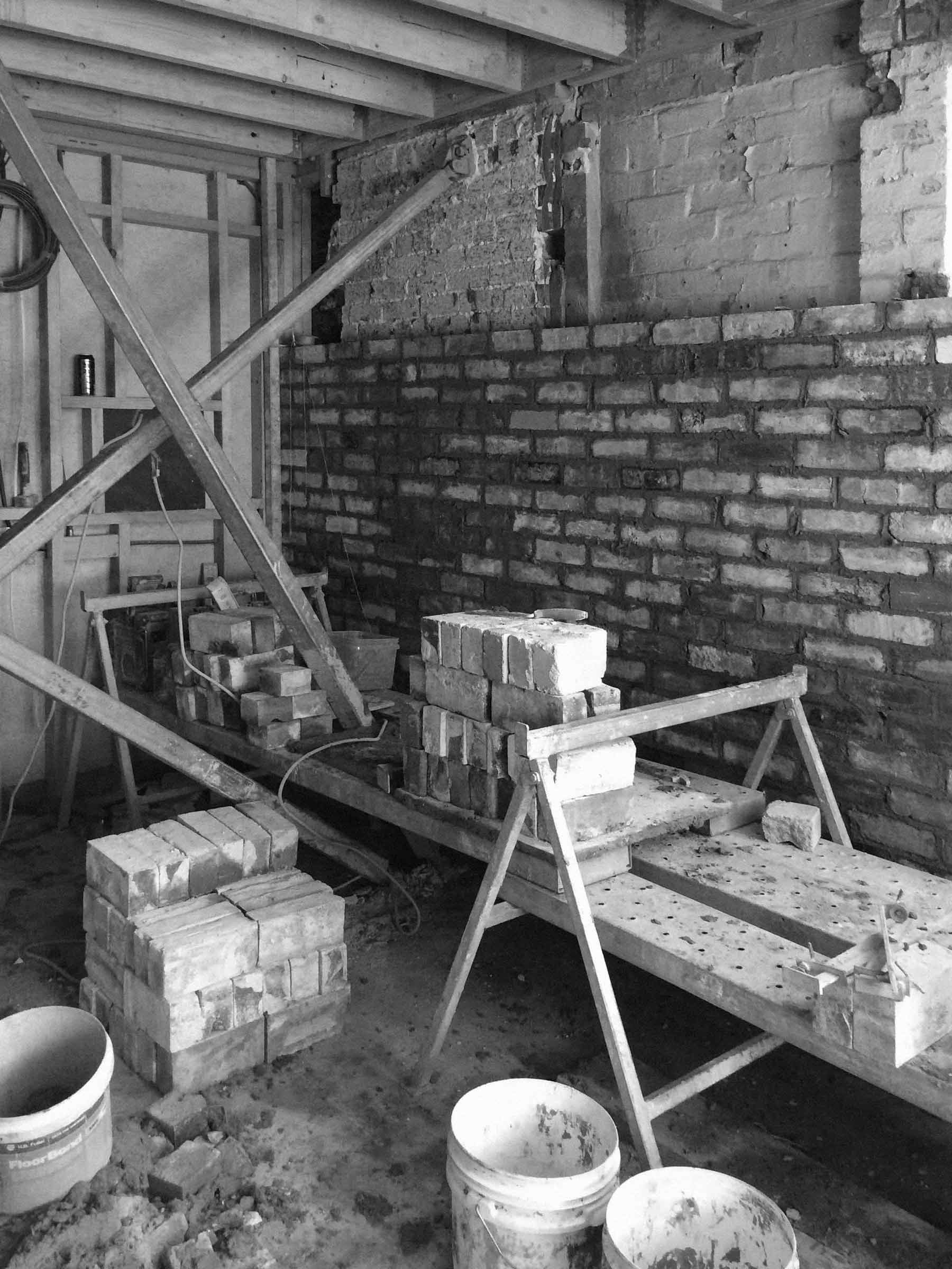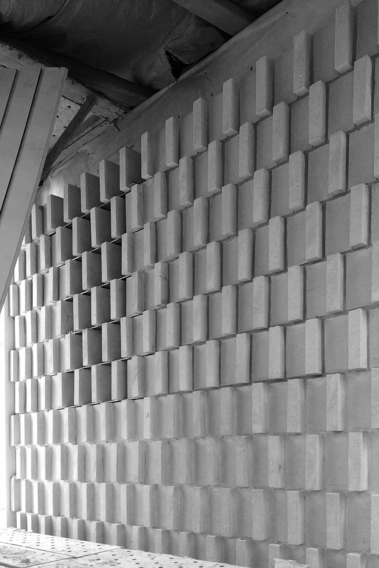 The rear façade of the terrace is extensively re-worked to make the most of its sunny orientation. Like the street façade, it is formed with solid masonry blocks. However, on the new façade, these blocks dematerialise, forming a hit-and-miss screen that provides layered climatic control. Inside, the rooms witness speckled light as the sun passes by.